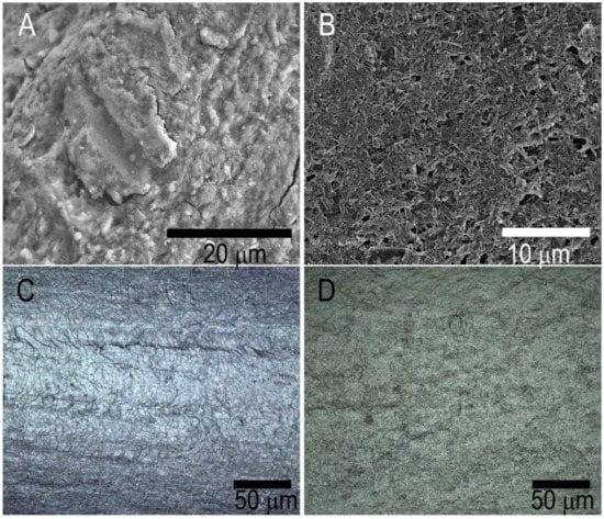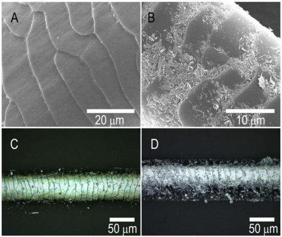 We obtained SEM and 3D scanning confocal microscopy images of the pristine and acetone-treated (unwaxed) capybara hair samples (Figure 2). Capybara hair visually consists of two adjacent keratin filaments, forming a valley where the filaments are attached. The hair is hydrophobic due to the presence of the wax layer, which is required to render the hair surface more water-resistant. Although this aspect of capybara zoology was not studied thus far, to the best of our knowledge, we assume that hair in capybaras is not needed for thermoregulation. Like other aquatic mammals, a layer of subcutaneous fat protects from low temperatures. However, water-repellant hair is needed for better removal of water droplets once the animal is out of water. As we noticed, this wax layer on the hair can be completely coated with evenly distributed halloysite nanotubes, deposited following a previously established protocol [3]. This coating is considerably denser and thicker than prior reports of nanoclay coatings for human hair [3,4]. In Figure S1 we show the electron micrographs of acetone-treated capybara hair, where the wax layer was removed from the hair surface. Acetone dissolved hair wax, but it did incur damage to keratin protein cuticles located beneath the wax layer. Due to the absence of wax, the halloysite coating was less prominent and not evenly distributed, probably being hanged mostly in the remaining hydrophobic sites between the cuticles. Halloysite distribution of two types of capybara hair was also visualized with 3D laser scanning microscopy (Figure 2C,D). These images confirm the effective spatial deposition of the nanotubes onto the natural wax-covered capybara hair.