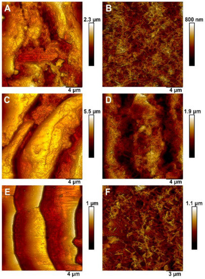 AFM topography images of capybara (A–D) and guinea pig (E,F) hair before and after coating with halloysite. Interestingly, on the nanoscale, the wax-free capybara hair demonstrated the increased cuticle roughness of both Ra (arithmetical mean roughness) and Rq (root mean squared roughness) which occurs apparently due to the removal of the smoothing wax layer.