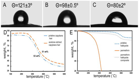 Water contact angle on pristine capybara hair (A), guinea pig (B), and acetone treated (unwaxed) capybara hair (C); thermogravimetric analysis of capybara pristine and acetone etched hair (D); and of permethrin, pristine halloysite, and permethrin-halloysite composite (E).