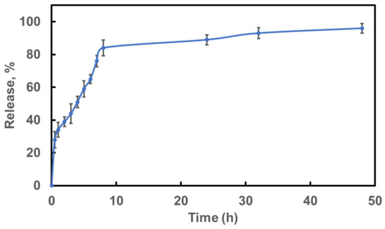 We estimated the wax content in capybara pristine hair and unwaxed hair using thermogravimetric analysis (TGA). A slight weight loss difference at the end of the 600 °C is attributed to the thermal decomposition of the wax, which constitutes ca 5 wt% of the pristine capybara hair (Figure 5D). This wax may be degraded in the region of 120 to 170 °C with the cortical cells denaturation which starts from 400 °C and the keratin denaturing which starts from 170 °C. Keratin fully degraded at 400–500 °C [32] and then the hair strands weight stabilized, as we show in Figure 5E. Using thermolysis, we also evaluated the loading of permethrin halloysite nanotubes. TGA profiles were obtained individually for permethrin, halloysite, and permethrin-loaded halloysite composites at a temperature ranging from 100–600 °C. Permethrin degrades within the temperature range of 200–430 °C. A peak at 480–520 °C indicates pristine halloysite degradation. Analysis of permethrin-halloysite composite quantifies 4.9 ± 0.5 wt% loading of drugs in the clay nanotubes which were used further for animal hair coating for the anti-lice experiment. The drug release profile from halloysite nanotubes was obtained in ethanol to demonstrate the maximum release of the drug over time. Permethrin release from the halloysites in ethanol was monitored for up to 48 h. Figure 6 shows an initial burst of the drug in ethanol within half an hour but after the first hour permethrin releases at a sustained rate with 86% released after 8 h and 98% release after 32 h. In a real scenario, the drug will be released in skin oil and water on the animal’s body which will give a much slower release than in ethanol, probably reaching many days and would be explored further in future studies.