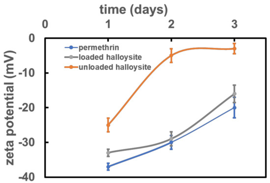Permethrin and drug-loaded and unloaded halloysite dispersions were made in DI water at pH 7 to carry out surface potential measurements. To determine the stability of the aqueous solutions, the samples were stored at room temperature for 3 days while zeta potentials were measured every day with the Brookhaven Zeta-Plus instrument (Brookhaven, Holtsville, NY, USA) [27,28].