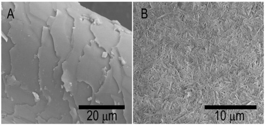 SEM images of pristine (A) and wax pretreated (B) goat hair coated with halloysite nanotubes.