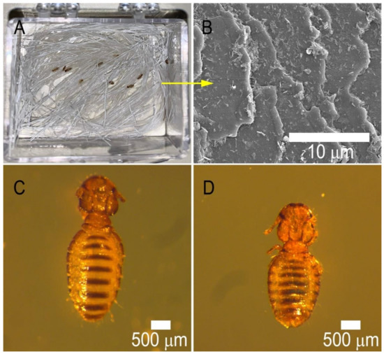 In a separate set of experiments, we removed all the dead lice, washed hair again, and reintroduced a new batch of lice; the treatment still worked well: two–three lice survived in 8 h and all the lice were killed within 16 h. The halloysite coverage on hair was observed in Figure 10C, where at least 15% of hair was covered with nanotubes. When the mortality results were compared with permethrin solution treatment after two hair washes, one can see a great improvement in the lice elimination. This implies that a stable water-resistant halloysite coating provides a sufficient drug amount for long-lasting animal protection.