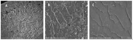 SEM images of drug-HNT composite deposited on goat hair (no washing) (A), hair washed one time after the clay deposition (B), and hair washed two times after deposition (C).