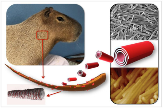 We demonstrate the principles of our approach of animal hair (fur) surface engineering in Scheme 1, where the deposition of halloysite onto capybara hair is depicted. Capybaras, the world’s largest rodents from South America, are becoming more popular as zoo animals [14] and even pets, thus requiring special attention for anti-parasite treatment. This is why we have chosen the capybara hair for detailed investigation.