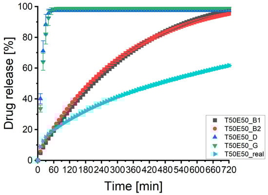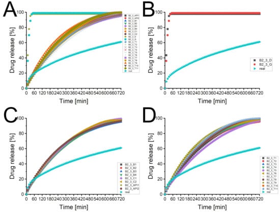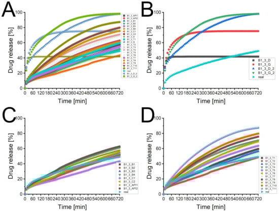 Costa and Lobo reviewed several approaches to compare dissolution profiles [12]. In this work, the similarity ( and factor) of the predicted profiles compared to the experimental one is calculated as it is the recommended approach by the FDA and European Medicines Agency [12,13,14]. Furthermore, the kinetics are analysed with the Higuchi and Korsmeyer–Peppas plot to determine the release mechanism [15,16,17,18].