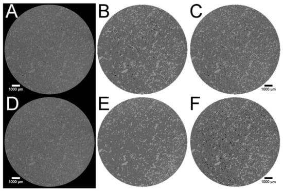 Cross-section 84 of different virtual tablets based on the XCT image of tablet 3 of batch T25E75. Theophylline is always displayed as light grey, ethyl cellulose as dark grey, and air as black. The scale of all images is equal. (A,D) Binned XCT image. (B) Virtual tablet T1. (C) Virtual tablet T2. (E) Virtual tablet T4. (F) Virtual tablet T7.