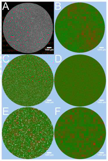 Different cross-sections of tablet 3 of batch T25E75. Theophylline is represented as light grey or red, ethylcellulose as dark grey or green, and air as black or white, respectively. (A) Cross-section 88 of the binned XCT image. (B) Cross-section 88 of the virtual tablet created by the PAC-module using the final processed XCT image of the pathway B1. (C) Cross-section of the virtual tablet obtained by distributing the target masses of the compounds. (D) Cross-section of the virtual tablet obtained by distributing the both compounds in the determined ratio until the interparticular porosity is 0. (E) Cross-section of the virtual tablet obtained by distributing seeds and growing them to the target masses of the compounds. (F) Cross-section of the virtual tablet obtained by distributing seeds and growing them in the determined ratio until the interparticular porosity is 0.
