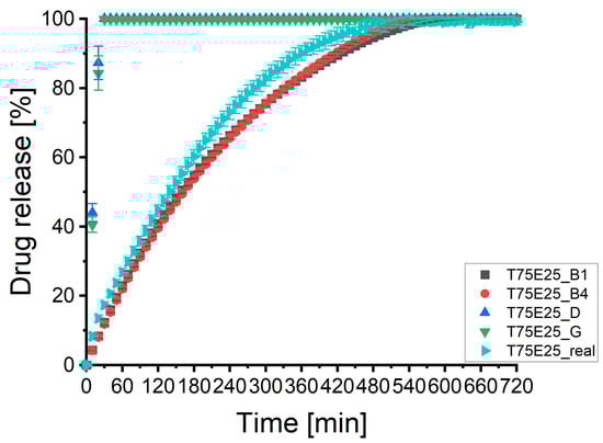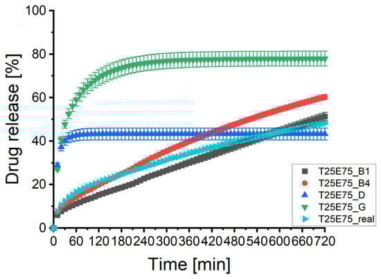 Figure 8 illustrates the mean dissolution profiles of three tablets. The shapes of the profiles remained the same by low standard deviations. Therefore, the results were reproducible. The results of the statistical analysis (Table A3 in the Appendix A) were in line with the results presented above. The DS-module was able to predict the dissolution profiles of batch T75E25. In contrast to the results of Section 3.3 and Section 3.4 the statistical significant deviations had no practical relevance if virtual matrices based on XCT images were used.