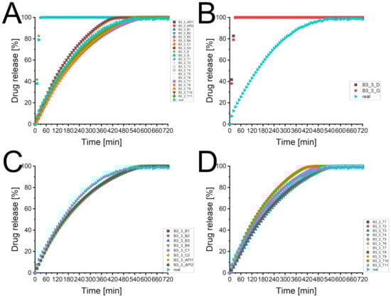 The profiles were analysed regarding their kinetics by using the Higuchi and Korsmeyers–Peppas plot [15,16,17,18]. The linear regression line was calculated for all data points within 20% to 60% drug release. If less then 4 data points were in this range, the profile was excluded from the kinetic analysis. The equations of the linear regression lines and the adjusted of both plots were used to determine the kinetics. Additionally, slope and intercept of the regression line of the simulated dissolution profile were statistically tested against the regression line of the experimental dissolution profile using t-tests [50,51].