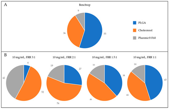 Graphical representation of the composition of H-NMeds. Blue: PLGA content. Orange: Cholesterol content. Grey: Pluronic® F68 content. (A) H-NMeds obtained with nanoprecipitation. (B) H-NMeds obtained with microfluidic-based protocols using a concentration of materials in the organic phase of 10 mg/mL and different FRRs, namely, 3:1 (left), 2:1 (center) and 1:1 (right).
