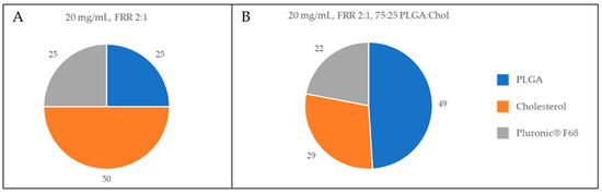 Graphical representation of the composition of H-NMeds. Blue: PLGA content. Orange: Cholesterol content (CC %). Grey: Pluronic® F68 content. (A) H-NMeds obtained with the microfluidic device at a concentration of 20 mg/mL and an FRR of 2:1. (B) H-NMeds obtained with microfluidic-based protocols using a ratio of PLGA:Chol of 75:25, using an initial concentration of 20 mg/mL, and an FRR of 2:1.