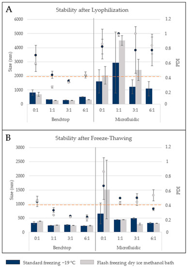 To further assess if the most similar formulation showed other similar characteristics, the two optimized H-NMeds were tested for storage stability. Storage stability is crucial for industrial and clinical use: a good storage stability allows for easier industrial production and transport of therapeutics, while the lack of storage stability implies that the product has to be formulated the same day of administration, increasing human error and variability. H-NMeds from benchtop protocols are known to be stable to lyophilization; therefore, samples of benchtop-and microfluidic-derived H-NMeds were lyophilized and tested for size and homogeneity analysis after resuspension. Moreover, different amounts of cryoprotectant were added, from 0 to 6 times the weight of the H-NMeds in the aliquots tested. The method of freezing was also varied, using a standard slow freezing method and flash freezing by immersion in a dry ice and methanol bath (Figure 3A).