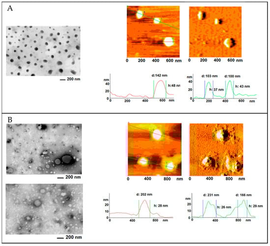Microscopy images of H-NMeds produced via (A) nanoprecipitation or (B) the microfluidic device. (Left panels): STEM imaging. (Right panels): AFM imaging, topography, and error signal.