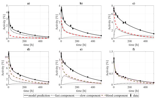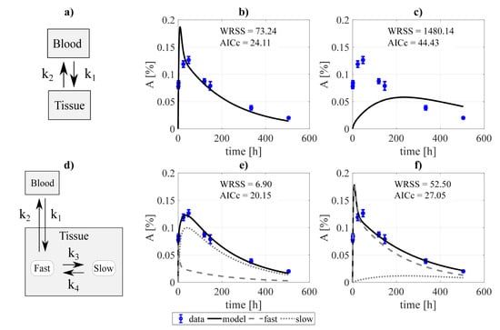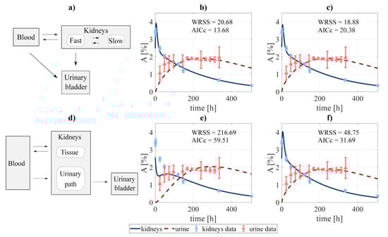 In addition, two slightly different scenarios were investigated for the particular case of modeling the excreted activity. In the first one (Figure 2a), the activity in the urinary bladder can come both from the fast component of the kidneys and directly from the blood. In the second scenario (Figure 2d), the activity in the urinary bladder travels from the blood to the bladder passing through the urinary path. The latter scenario is analog to that implemented by [40] for modeling the biokinetics of fluorocholine. As in the previous case, different fits were performed involving different combinations of the rate constants. Finally, the process led to choose the structure shown in Figure 2a, excluding the blood-bladder path (fit shwon in Figure 2b), as the best option, with an of 13.68 (versus 20.38, 31.69, and 59.51 for the alternatives shown in Figure 2c,e,f, respectively).