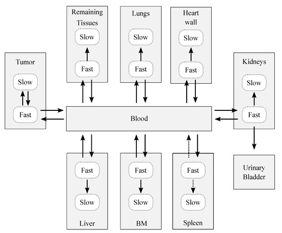 After the decoupling process, the resulting complete model (Figure 3) was conformed by 18 compartments, which represent 10 structures: 7 organs (the spleen, bone marrow, heart wall, kidneys, liver, and lungs), a remaining tissues structure (accounting for the non-explicitly-modeled tissues), the tumor, blood, and urinary bladder contents. The decoupling analysis revealed that, in general, each organ was well modeled with two compartments and four adjustable parameters: three rate constants that describe the flow of CLR1404 between fast-slow compartments and the blood pool, and an extra parameter to account for the blood volume that is permanently held by each tissue, the blood fraction. Therefore, each organ compartment that was characterized in the model is interpreted as dry tissue (no blood fraction included).