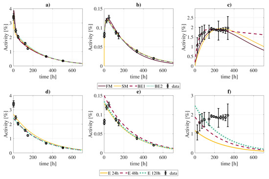 Comparison of best fits of time activity curves (kidneys, panels (a,d); tumor, panels (b,e); excreted activity, panels (c,f)) obtained with the full model and different approximations: “FM” (full model); “SM” (simplification of the full model without slow components except for RT and tumor); “BE1” (biexponential fit with the entire dataset); “BE2” (biexponential fit with only 4 points at [2, 24, 120, 505] h); “E 24 h”, “E 48 h”, “E 120 h” (exponential fits considering the physical decay of activities measured 24 h, 48 h, and 120 post-injection, respectively).