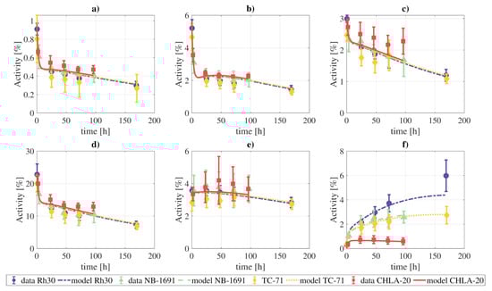 Fitting of the complete model to the combined tissue activities reported for xenografts in [1]: (a) lungs, (b) heart, (c) kidneys, (d) liver, (e) marrow, (f) tumor. The parameters which govern the tumor compartments were allowed to vary individually for each tumor cell line. The objective function reached a value of .