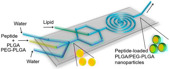 In the last two decades, considerable effort has been directed at improving formulation methods for producing polymeric nanoparticles. Versatile methods used to fabricate PLGA nanoparticles include nanoprecipitation, emulsion and hydrogel template methods, the use of supercritical CO2, spray drying, coacervation, microfluidics, and the PRINT technique (particle in non-wetting templates) [5,6,7,8,9]. Compared with other methods, the microfluidic method has significant advantages, including the precise control over particle parameters (e.g., size, morphology, and charge) [10,11], monodispersed particles, automated and single-step formulation, as well as relatively high encapsulation efficiency [12,13,14]. This relatively novel formulation method provides homogeneous mixing conditions by precisely controlling micro flows, which cannot be achieved in conventional bulk methods [15,16]. Using microfluidics, the physicochemical properties of nanoparticles, including size, shape, structure, rigidity, and surface modification, can be controlled [16,17]. Additionally, lipid shell coated PLGA nanoparticles fabricated by a microfluidic method further extended the circulation half-life [18] and enhanced tumour accumulation and therapeutic effect [19].