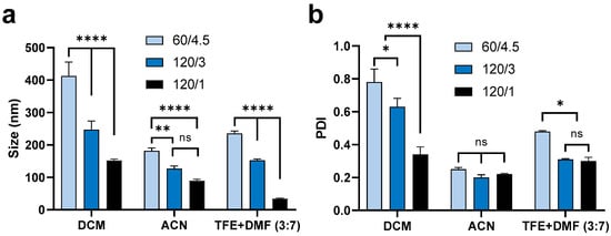 Mean (±SEM) (n = 3) size (a) and PDI (b) of ‘blank’ PLGA nanoparticles formulated using 1% PLGA in DCM, ACN, and TFE + DMF (3:7, v/v) under a range of side/centre flow rate conditions (water inside inlets to solvent in centre inlet, 60/4.5 = 60 to 4.5 mL/h, 120/3 = 120 to 3 mL/h, 120/1 = 120 to 1 mL/h). Using the same solvent, increasing flow rate and flow rate ratios significantly decreased the size of nanoparticles. Increasing flow rate or flow rate ratio caused a dramatic decrease in the PDI of nanoparticles formulated using DCM but did not significantly affect nanoparticles formulated using ACN or TFE + DMF (3:7). Two-way ANOVA analysis followed by Tukey test for multiple comparisons (**** p < 0.0001; ** p < 0.01; * p < 0.05; and ns, no significant difference).