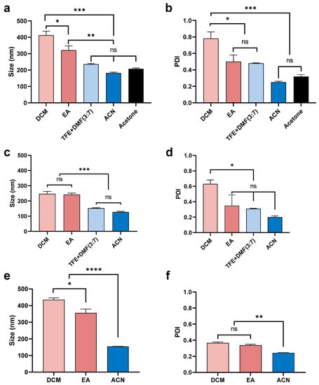 Mean (±SEM) (n = 3) size (a) and PDI (b) of blank nanoparticles formulated using a low sides/centre flow rate ratio (60/4.5) using 1% PLGA in a range of organic solvents (DCM, EA, TFE + DMF (3:7, v/v), ACN, and acetone). Nanoparticles fabricated using DCM had the largest size (400 nm) and the highest PDI (0.8). By comparison, use of ACN resulted in particles of the smallest size (<200 nm) and lowest PDI (~0.2). Mean (±SEM) (n = 3) size (c) and PDI (d) of blank nanoparticles formulated using a high sides/centre flow rate ratio (120/3) using 1% PLGA in different organic solvents (DCM, EA, TFE + DMF (3:7, v/v), and ACN). Both DCM and EA produced particles of a larger size (~250 nm) compared with ACN (~100 nm). DCM provided the highest PDI (0.6) while ACN led to the lowest PDI (<0.2). Mean (±SEM) (n = 3) size (e) and PDI (f) of 5% theoretical drug-loaded nanoparticles formulated with a low side/centre flow rate ratio (60/4.5) using 1% PLGA in different organic solvents (DCM, EA, and ACN). DCM provided a larger particle size (>400 nm) compared with EA (~350 nm) and ACN (150 nm). Solvents did not show a significant difference in PDI (0.2~0.3). One-way ANOVA analysis followed by Tukey test for multiple comparisons (**** p < 0.0001; *** p < 0.001; ** p < 0.01; * p < 0.05; and ns, no significant difference).