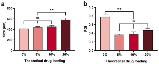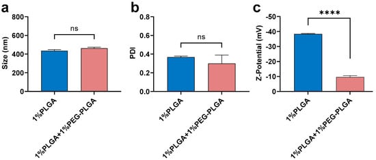 PLGA (1%) was compared with the mixture of 1%PLGA + 1%PEG-PLGA (Figure 5). There was no significant difference in size and PDI between nanoparticles fabricated using 1% PLGA or 1% PLGA + 1% PEG-PLGA when using DCM as the solvent and 5% theoretical drug loading (Figure 5a,b). This finding suggested that the addition of an extra 1% PEG-PLGA did not greatly affect particle size distribution. However, adding PEG-PLGA significantly decreased the Z-potential of nanoparticles (−10 mV) compared with PLGA alone (−40 mV) (Figure 5c). Our finding is consistent with others who have reported that PEGylation always results in a dramatic decrease in the charge of PLGA nanoparticles [51,52,53]. As reported by Garinot et al., the decreased zeta potential close to neutrality may result from the shielding effect of the PEG chains [53].
