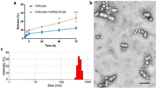 As shown in Figure 6a, peptide-loaded PLGA/PEG-PLGA nanoparticles achieved a maximum cumulative release of ~25% within 72 h, whereas the release from peptide-loaded PLGA nanoparticles was only ~13%. Additionally, PEG-PLGA was reported to form stealth nanoparticles, which have a longer in vivo circulation half-life [52]. However, more polymer concentrations and other types of PLGA with different L:G ratios, different molecular weights, and different terminal groups (e.g., ester group) remain for future investigation to achieve the optimal release profile [1].