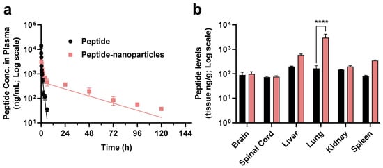 The innate immune targeted C5aR1 antagonist peptide encapsulated within the biodegradable nanoparticles had a significantly reduced elimination half-life in mice compared to the peptide itself (Figure 7a). Specifically, the plasma peptide levels after IV dosing with free peptide were unmeasurable after 6 h post-dosing whereas peptide from the nanoparticles was measurable in plasma samples for up to five days after a single IV dose administration. The terminal elimination half-life (t1/2) after dosing of mice with free peptide was 0.84 h, which is in agreement with the short t1/2 values of 0.17 h and 0.33 h reported previously [38,40]. The half-life of peptide in the form of nanoparticles was extended significantly (24.9 h). Similarly, peptide-loaded nanoparticles have a much longer mean residence time (MRT) (32.61 h) compared with that of the free peptide (0.76 h). The systemic exposure (AUC0–t) of peptide released from peptide-loaded nanoparticles was nearly five times larger than that for the free peptide (AUC for free peptide = 3825.7 ng.h/mL; AUC for peptide-loaded nanoparticle = 18,665.6 g.h/mL). Thus, our findings from the mouse pharmacokinetic study have confirmed that the peptide-loaded nanoparticles significantly increased the systemic exposure of this peptide when administered via the optimised nanoparticle formulation.