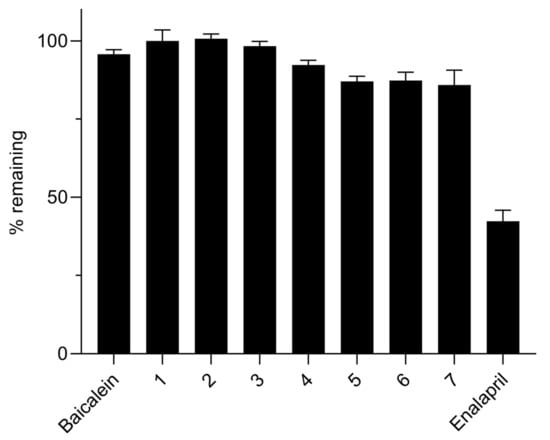 Working solutions of the test compounds (baicalein, enalapril, and compounds 1–7) prepared in 50 vol% aqueous MeOH at 40 μM were diluted in mouse plasma in triplicate to a final concentration of 1 μM. The mixtures were then incubated at 37 °C in a shaking water bath. A 50 μL aliquot was removed at 0 and 60 min from each incubation mixture followed by immediate mixing with 150 μL ice-cold MeOH containing 1 μg/mL glipizide as the internal standard (IS). The resulting mixtures, following a 5-min vortexing and sonication, were then centrifuged at 3000 rpm for 30 min at 4 °C. The supernatant was analyzed by Agilent 6460 QQQ LC−MS/MS system in a positive multiple reaction monitoring (MRM) mode. Gradient elution was conducted on an Agilent Eclipse Plus C18 column (100 × 2.1 mm, 3.5 µm) at 40 °C with 0.1 vol% formic acid in deionized water and 0.1 vol% formic acid in acetonitrile running at 0.45 mL/min. MRM transitions of the analytes were set as follows: baicalein: m/z 271→123, enalapril: m/z 377→234, 1: m/z 428→271, 2: m/z 414→271, 3: m/z 428→271, 4: m/z 416→271, 5: m/z 462→271, 6: m/z 386→271, 7: m/z 372→271, and glipizide: m/z 446→321. The analytical data were analyzed using Agilent MassHunter Quantitative Analysis Software (version B.05.00). Peak area ratios of the analytes vs. IS on the MRM chromatograms were used to calculate % remaining at 60 min.