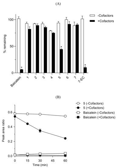 Metabolic stability of baicalein and its carbamate prodrugs in the mouse liver S9 fractions. Test compounds were incubated at 37 °C with mouse liver S9 fractions in the absence and presence of the cofactor mixture (NADPH, UDPGA, PAPS and GSH). (A) % remaining was determined at 60 min vs. time 0 using peak ratios of LC−MS/MS chromatograms (mean ± SD, n = 3). * p < 0.001 (multiple unpaired t test). (B) Time course of compound 5 disappearance and its conversion to baicalein was determined simultaneously in the mouse liver S9 fractions following incubation of compound 5 in the absence and presence of the cofactor mixture (mean ± SD, n = 3).