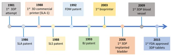 The introduction of 3DP dates back to 1981 when Dr. Kodama attempted to prepare 3D-shaped objects by exposing photosensitive resins to ultraviolet (UV) rays using a single laser beam controlled by a mask [4]. Although his work was not patented at the time, it initiated a tight race towards developing 3DP techniques. Kodama’s concept later led to the development of stereolithography (SLA) technology. The SLA was taken up by Charles Hull who patented it in 1986. The process involved hardening liquid polymers layer by layer using UV light, and the procedure was orchestrated by computer-controlled beam and digital data. Shortly after, 3D systems released the first 3D commercial printer in the world (SLA-1) [5]. Subsequently, selective laser sintering (SLS) and fused deposition modelling (FDM) were patented in 1988 and 1992, respectively. SLS is based on fusing powdered printing materials by laser beams, whereas FDM involves depositing layers of molten polymers extruded from a heated nozzle. The nozzle movement is controlled by a computer executing a designed digital model [6,7]. The binder jet printer (BJ), also called powder bed and inkjet head 3DP, was developed and patented by Sachs et al. in 1993 [8]. Afterward, Thomas Boland created the first bioprinter that uses bio-inks to fabricate different objects including biological tissues using a semi-solid extrusion mechanism [9] (Figure 1).
