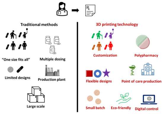 The conventional drug treatment approach is often based on “one size fits all” where most patients receive the same drugs at the same doses and frequencies, which has shown varied responses and has been linked to adverse drug reactions [10]. Personalised medicine is becoming very popular in recent years and refers to an approach of tailoring medical treatment to patients on the basis of their characteristics such as genetic profile, concurrent medicines, and disease state. Personalised medicine is safer and more efficacious, improves patient compliance, and is cost-effective [11]. Nevertheless, the progress of personalised medicine has been partially limited by the absence of appropriate dosage forms of desired dose strength, shape, and colour, among others. Pharmaceutical industries develop drugs according to the most abundant and representative therapeutic response profile. It does not take all particularities of every individual into account. This is particularly evident for paediatric and geriatric populations, increasing the risk of treatment failure or adverse effects. Dose adjustment according to weight, age, and pharmacogenetic and pharmacokinetic characteristics are key to achieving the desired therapeutic effect and improving the efficacy/toxicity balance. Likewise, a modification of colours, flavours, and even the form of the solid dosage forms would considerably increase the adherence to treatment in children and the elderly [12]. 3DP has the potential to play a revolutionary role to fill the current gap associated with conventional drug production. It fabricates unlimited 3D dosage forms designed using computer-aided design (CAD), offering the possibility for tailored drugs and personalised treatment options.