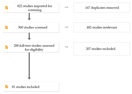 The search engines resulted in a total of 822 articles. The digital object identifier system was used to remove duplicates, which resulted in 167 articles. We performed study selection using Covidence in a two-step process, where two review authors (S.H.A. and S.H.Y.) independently screened all titles and abstracts on the basis of the inclusion criteria and subsequently retrieved all relevant data on the basis of the criteria mentioned in the Section 2. Any discrepancies were resolved by discussion until consensus was reached. The excluded articles totalled 207, leaving 81 articles to be included in this review (Figure 4).