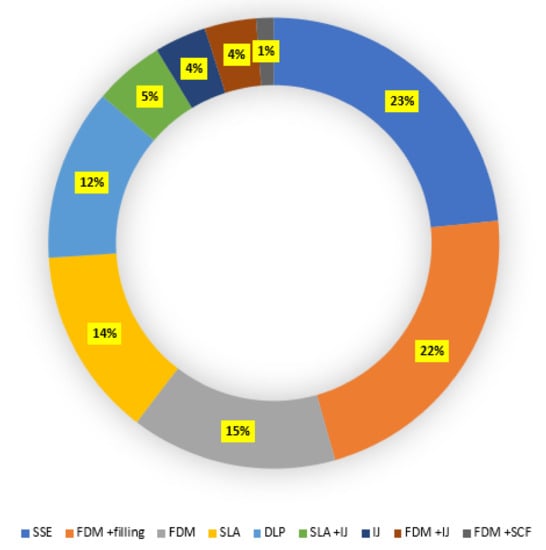 Several 3DP techniques were reported for the printing thermolabile drugs. Commercial and built-in-house printers were employed for the fabrication of the dosage forms. SSE was the most used 3DP technique and applied in 23% (n = 19) of the studies considered in this systematic review. FDM, SLA, and DLP were applied in 15% (n = 12), 14% (n = 11), and 12% (n = 10) studies, respectively. FDM coupled with filling (automatic/manual) was mentioned in 23% (n = 18) of the studies. A combination of other techniques such as FDM and binder jetting, FDM and super critical fluid technology, and SLA and inkjet were also reported in the literature. All studies used commercial printers except two studies that used an in-house-developed printer to fabricate drug dosage forms (Figure 5, Table 1).