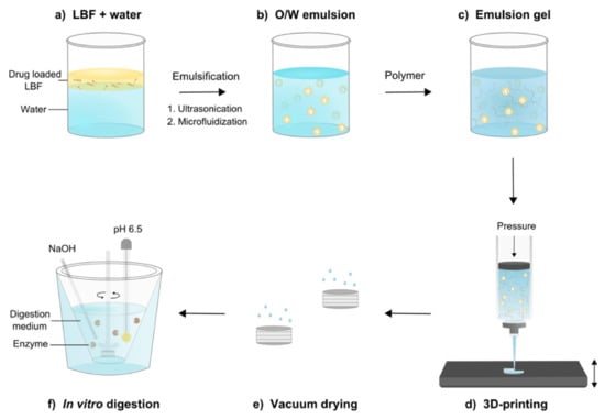 Schematics illustrating the preparation of printable emulsion gels, 3D printing by semi-solid extrusion (SSE), and in vitro digestion of 3D-printed tablets. (a) Drug-loaded lipid-based formulation (LBF) was added to water, followed by (b) a two-step emulsification process. (c) Polymers were added to emulsified LBFs to generate printable emulsion gels. (d) The emulsion gels were 3D-printed by SSE into tablets, and (e) vacuum-dried. (f) 3D-printed tablets were digested in an in vitro lipolysis set-up to quantify the release of free fatty acids (FAs). Figures reproduced with permission from [57].