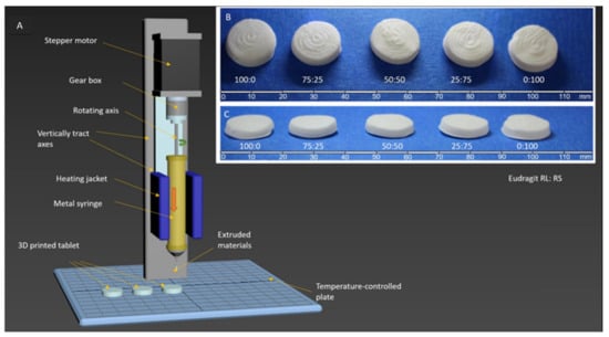 (A) Set-up for direct extrusion 3D printing. The printer is equipped with a metal syringe surrounded by a temperature-controlled heating jacket. The syringe is fitted with a luer-lock stainless steel needle (G18), and the pharmaceutical ink (compressed powder) is added. The ink is then extruded by a piston pushed by a computer-controlled stepper motor equipped with gear to produce 3D-printed tablet. (B) Top and (C) side photographs of 3D-printed tablets based on Eudragit RL: RS: 100:0, 75:25, 50:50, 25:75, and 0:100. Figures reproduced with permission from [58]. Copyright Elsevier, 2021.
