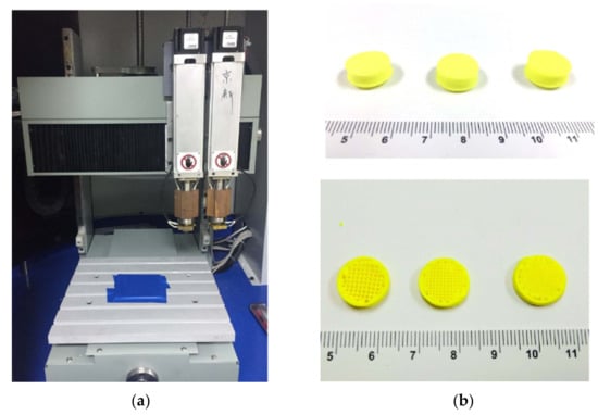 (a) Commercial extrusion-based dual-nozzle 3D printer. (b) The 3D-printed gastro-floating tablets with different infilling percentages and the section of the tablets; the infilling percentages are 30%, 50%, and 70% from left to right. Images reproduced with permission from [60]. Copyright Elsevier, 2018.