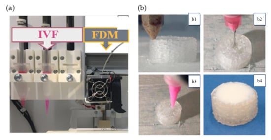(a) Integration of FDM with IVF and (b) (b1) extruder of FDM technology. (b2) Syringe of IVF technology injecting the drug-loaded gel. (b3) Syringe of IVF technology injecting the delaying release polymer. (b4) Obtained images of final printfill of the tablets. Images reproduced with per-mission from [99]. Copyright Elsevier, 2019.