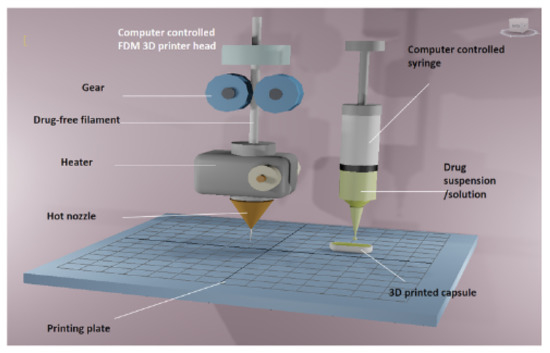 Tiboni et al. reported automatic filling of drug delivery devices produced using an Ultimaker 3 printer (Ultimaker, Geldermalsen, The Netherlands). The device was loaded with a model drug, cannabidiol, containing a formulation prepared using two different model nanocarriers (i.e., polymeric nanoparticles and liposomes). The formulations were loaded onto the devices through two syringes mounted on two syringe pumps (Aladdin syringe pump, WPI Europe, Friedberg (Hessen), Germany) through polyethylene tubing. The organic solvent used in the formulation was evaporated under a stream of nitrogen [113]. Similarly, Okwuosa and co-workers reported a fully automated additive manufacturing process that combined FDM and liquid dispensing to fabricate individualised dosage forms on demand (Figure 12). They modified a dual FDM 3D printer to include a syringe-based liquid dispenser. Polymethacrylate shells (Eudragit EPO and RL) for immediate and extended-release were fabricated using FDM 3DP and simultaneously filled using a computer-controlled liquid dispenser loaded with model drug solution (theophylline) or suspension (dipyridamole). Dipyridamole suspension was prepared at room temperature while theophylline solution was prepared by mixing components at 65 °C [114].