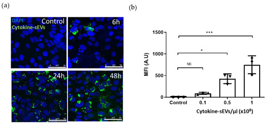 To determine the kinetics of the uptake of cytokine-sEVs by BECs, cytokine-sEVs were labelled with the lipophilic dye DiO, and their uptake by hCMEC/D3 cells was analysed using confocal microscopy and flow cytometry. Confocal microscopy showed a predominately perinuclear localisation of DiO staining with some staining dispersed in the cytoplasm (Figure 2a). The EV uptake was qualitatively similar at the 24-h and 48-h time points, suggesting that a level of saturation was achieved by 24 h. Based on these observations, we chose the 24-h end point for the dose response experiments using flow cytometry. A flow cytometry analysis of the mean fluorescence of DiO-labelled cytokine-sEVs revealed that the uptake of cytokine-sEVs by hCMEC/D3 cells was also dose-dependent (Figure 2b).