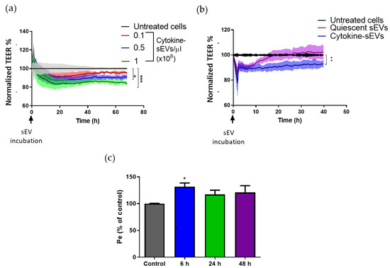The loss of paracellular barrier function is an established characteristic of brain endothelial cell dysfunction, which can be studied by measuring the electrical impedance of the endothelial monolayer [32]. Thus, we evaluated the effect of cytokine-sEVs on the impedance of BECs. A dose-dependent decrease of the TEER values was observed after the incubation of hCMEC/D3 cells with cytokine-sEVs (0.1, 0.5 and 1 × 108 sEVs/µL) (Figure 3a). We observed a peak in decreased TEER at 83 ± 6% in comparison to the control cells with 1 × 108 cytokine-sEVs/µL. However, longer incubation times did not cause a further decrease in TEER (Figure 3a). Next, hCMEC/D3 cells were treated with either quiescent BECs or cytokine-treated BECs (0.5 × 108 sEVs/µL) to further characterise the specific effect of cytokine-sEVs on TEER. We observed that, after 10 h of incubation with sEVs, a decreased endothelial resistance was only observed in sEVs derived from cytokine-activated hCMEC/D3 cells (Figure 3b). No significant effect was observed with quiescent sEVs. To further confirm the role of cytokine-sEVs modulating the BBB permeability, the para-cellular permeability of 4-KDa FITC-Dextran was evaluated (Figure 3c). Incubation with 0.1 × 108 cytokine-sEVs/uL showed a small but significant increase in para-cellular permeability after 6 h of treatment. This effect was transient, since a longer incubation only showed a small trend for increased para-cellular permeability.