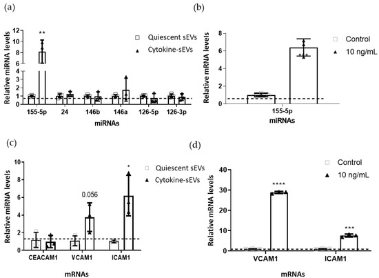 Since EVs are known to carry genetic material that may influence BEC functions, we next decided to investigate the differences in the miRNA contents of cytokine-sEVs compared to quiescent sEVs. We first selected a series of miRNAs that are known to be upregulated (miRNA-155-5p, miRNA-146a and miRNA-146b); downregulated (miRNA-126-5p and miRNA-126-3p) or unchanged (miRNA-24) in hCMEC/D3 cells after treatment with TNFα and IFNy and whose role in modulating hCMEC/D3 functions is known [35]. All miRNAs were detectable in both cytokine- and quiescent sEVs (Figure 5a). The RT-qPCR analysis of the vesicle cargo revealed that the miRNA-155-5p expression was increased 8.20 ± 2.10-fold (p = 0.004) in cytokine-sEVs compared to quiescent EVs (Figure 5a). The anti-inflammatory miRNA-126-3p showed a trend towards downregulation in cytokine-sEVs (0.75 ± 0.56-fold change, p = 0.49), but this was not statistically significant (Figure 5a). No difference was observed in the expression of miRNA-146a, -146b, 126-5p and -24 between quiescent and cytokine-sEVs (Figure 5a). The levels of miRNA-155-5p in cytokine-sEVs were confirmed to correspond with the endogenous expression of this miRNA in BECs after stimulation with 10 ng/mL of TNFα and IFNy for 24 h (6.40 ± 0.98-fold change, p = 0.0007) (Figure 5b). We also investigated the relative levels of mRNAs that are directly involved in T-cell adhesion and observed that ICAM1 mRNA was significantly increased in cytokine-sEVs (6.21 ± 2.29, p = 0.017), whereas VCAM1 mRNA showed a strong trend (3.77 ± 1.62, p = 0.054) (Figure 5c). Similar to previous reports [22], the upregulation of ICAM1 and VCAM1 mRNAs was also observed in hCMEC/D3 cells upon cytokine treatment (Figure 5d). By contrast, the mRNA levels of carcinoembryonic antigen-related cell adhesion molecule 1 (CEACAM1) were not changed in cytokine-sEVs (0.99 ± 0.70, p = 0.79) (Figure 5c).