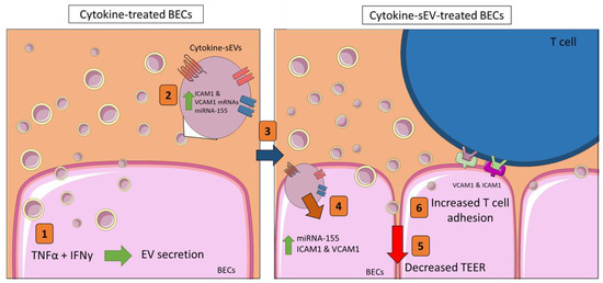 Interestingly, Cerutti et al. showed that the overexpression of miRNA-155-5p in brain endothelial cells indirectly increased the levels of ICAM1 and VCAM1 [28]. Therefore, we speculate that the miRNA-155/ICAM1/VCAM1 axis is likely to be involved in inducing the effect of cytokine-sEVs in the brain endothelium. However, we cannot rule out the possibility of alternative pathways mediating an increase in VCAM1 and ICAM1.