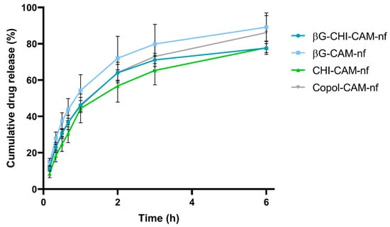 Cumulative release (%) of chloramphenicol from nanofibers during a 6 h test-period in a Franz diffusion setup. Abbreviations: βG (β-glucan), CHI (chitosan), Copol (co-polymers: polyethylene oxide and hydroxypropylmethylcellulose), CAM (chloramphenicol), nf (nanofibers). Results are presented as mean ± SD (n = 3).