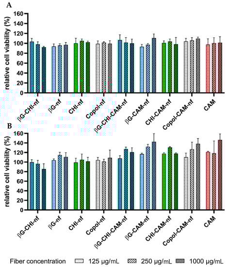 Relative cell viability (%) of (A) HaCaT cells and (B) macrophages (RAW 264.7) after 24 h incubation at 37 °C and exposure to nanofibers (dissolved in concentrations of 125, 250 and 1000 µg/mL) and chloramphenicol (CAM) (in concentrations of 1.25, 2.5 and 10 µg/mL). Results are presented as mean ± SD (n = 3). Abbreviations: βG (β-glucan), CHI (chitosan), Copol (co-polymers: polyethylene oxide and hydroxypropylmethylcellulose), CAM (chloramphenicol), nf (nanofiber).