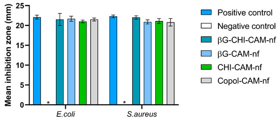 Antibacterial activity of chloramphenicol-containing nanofibers (containing 30 µg of chloramphenicol per fiber) compared to a standard 30 µg chloramphenicol disc as positive control and no-CAM containing nanofibers as negative control (*). Results are expressed as the mean inhibition zone (mm) ± SD (n = 3). Abbreviations: βG (β-glucan), CHI (chitosan), Copol (co-polymers: polyethylene oxide and hydroxypropylmethylcellulose), CAM (chloramphenicol), nf (nanofiber).