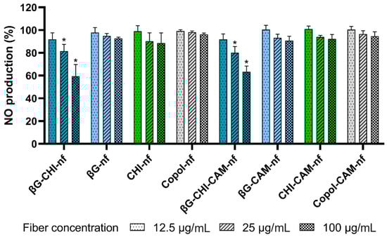 NO production (%) of LPS-induced macrophages (RAW 264.7 cells) after 24 h exposure to nanofibers in three different concentrations (12.5, 25 and 100 µg/mL) compared to untreated cells. Abbreviations: βG (β-glucan), CHI (chitosan), Copol (co-polymers: polyethylene oxide and hydroxypropylmethylcellulose), CAM (chloramphenicol), nf (nanofiber). Results are presented as mean ± SD (n = 3). Formulations marked with * are statistically significant (p < 0.05) compared to untreated LPS-stimulated macrophages.