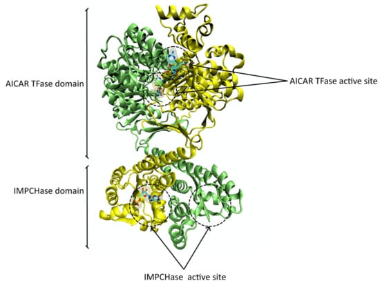 In humans, the de novo purine biosynthetic pathway requires six enzymes and ten successive steps to convert PRPP into IMP [56]. The 5-aminoimidazole-4-carboxamide ribonucleotide formyltransferase/inosine monophosphate (IMP) cyclohydrolase (ATIC) enzyme is a cytosolic bifunctional enzyme that catalyzes the final two steps of the pathway.