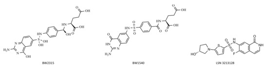 The first ATIC inhibitors developed were two sulfamido-bridged 5,8-dideazafolate analogs, designated BW1540 and BW2315 [57] (Figure 8). They are anti-folate inhibitors specific for the AICAR TFase active site; however, they have never been tested in vitro or in vivo. Recently, a potent new ATIC inhibitor designated LSN3213128 (Figure 8) has been proposed. It is a folate competitive non-classical anti-folate inhibitor selective for AICAR TFase relative to other folate dependent enzymes [66]. In vivo studies have shown that LSN3213128 is orally bioavailable and that it demonstrates anti-tumor activity in murine models [66,67].