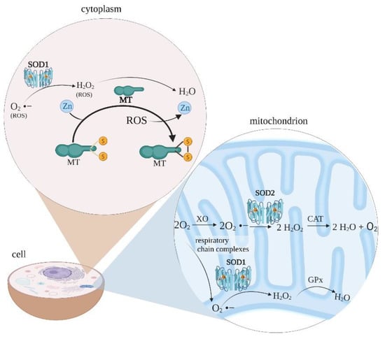 Figure 1. ROS management in the cell cytoplasm and mitochondrion. Metallothionein bound to zinc can scavenge free radicals because of its thiolate groups -SH. The Zn–MT complex provides a chemical basis on which the cysteine ligand exhibits antioxidant properties. In physiological terms, zinc bound to MT is released through oxidation of the thiolate group when the environment becomes oxidised, e.g., from the presence of free radicals. Creation of MT–disulfide follows zinc release. Mitochondrial-derived reactive oxygen species are formed by the conversion of oxygen to superoxide anion by xanthine oxidase or respiratory chain complexes in both matrix and intermembrane spaces. The superoxide anion is then converted to hydrogen peroxide by SOD. Hydrogen peroxide can be detoxified to water and oxygen with glutathione peroxidase or catalase. MT—metallothionein; SOD—superoxide dismutase; XO—xanthine oxidase; CAT—catalase; GPx—glutathion peroxidase; ROS—reactive oxygen species. The figure was created with BioRender.com.